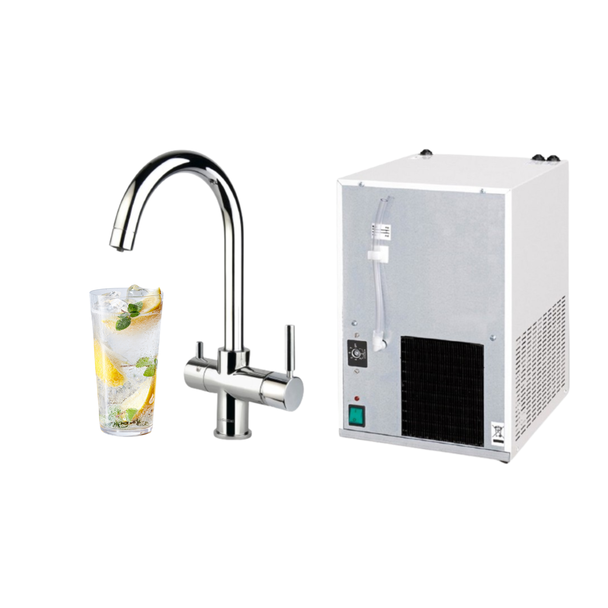 W skład zestawu wchodzi schładzarka o wydajności 15 l/h, bateria wielofunkcyjna, pakiet instalacyjny, filtr 3M, głowica do filtra.