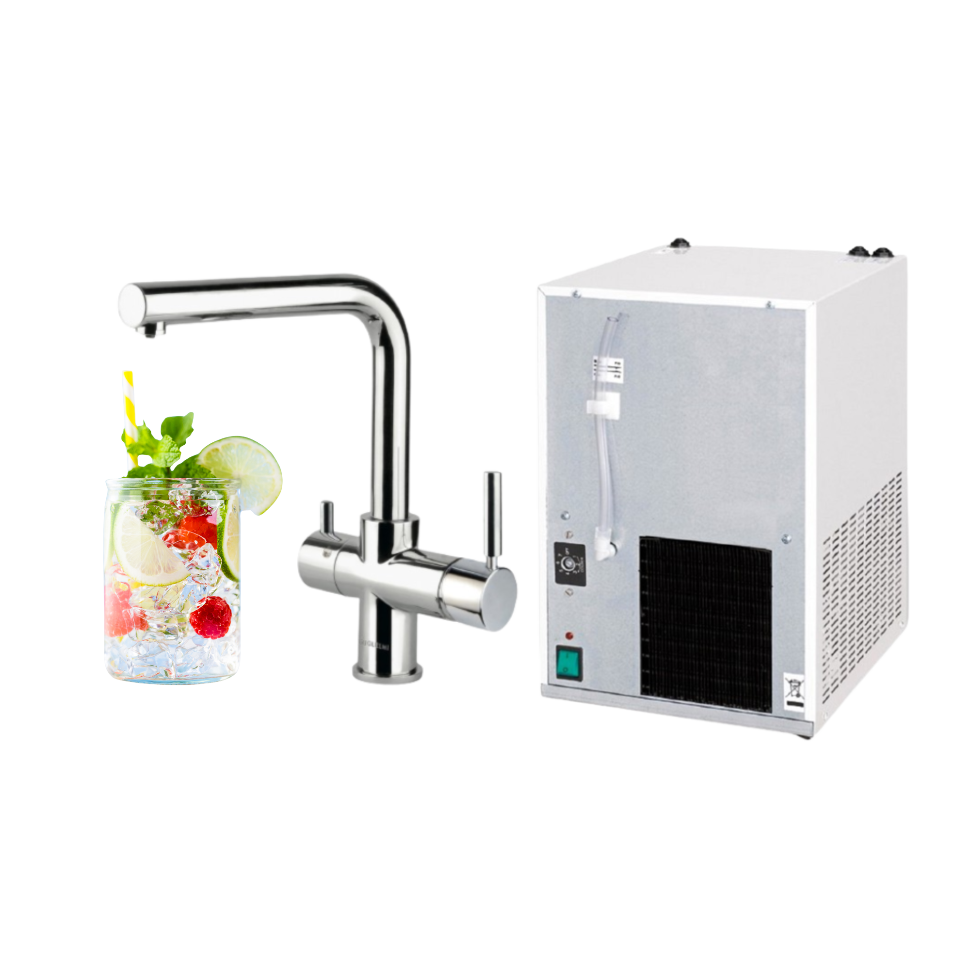 W skład zestawu wchodzi schładzarka o wydajności 15 l/h, bateria wielofunkcyjna, pakiet instalacyjny, filtr 3M, głowica do filtra.
