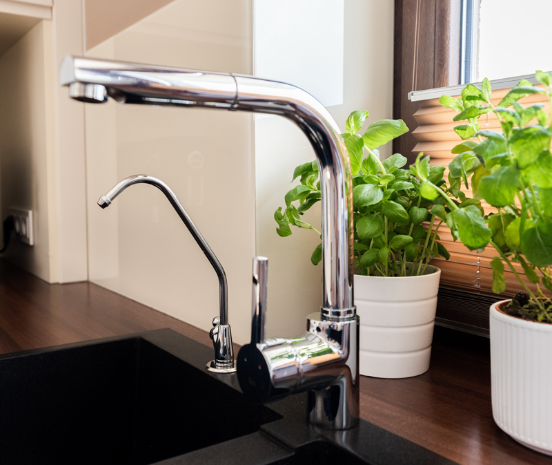Dyskretny i prosty w instalacji. Bateria (kranik) montowana przy zlewie umożliwia łatwy i nieograniczony pobór wody gotowej do spożycia